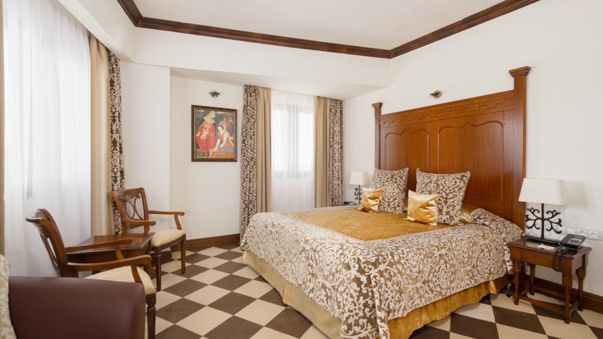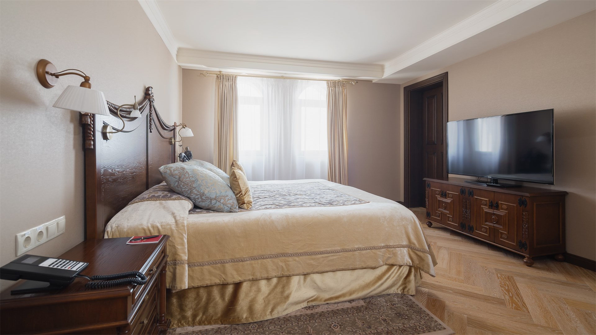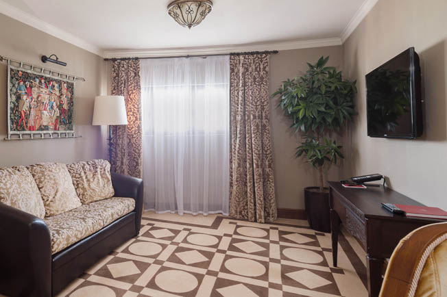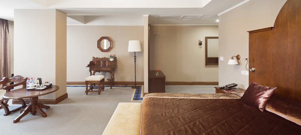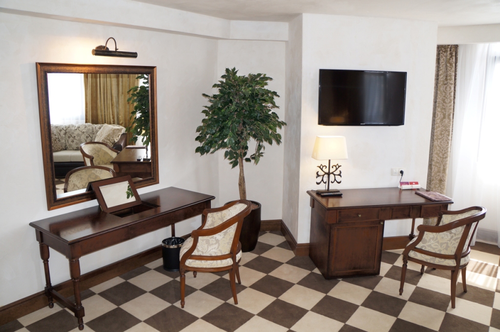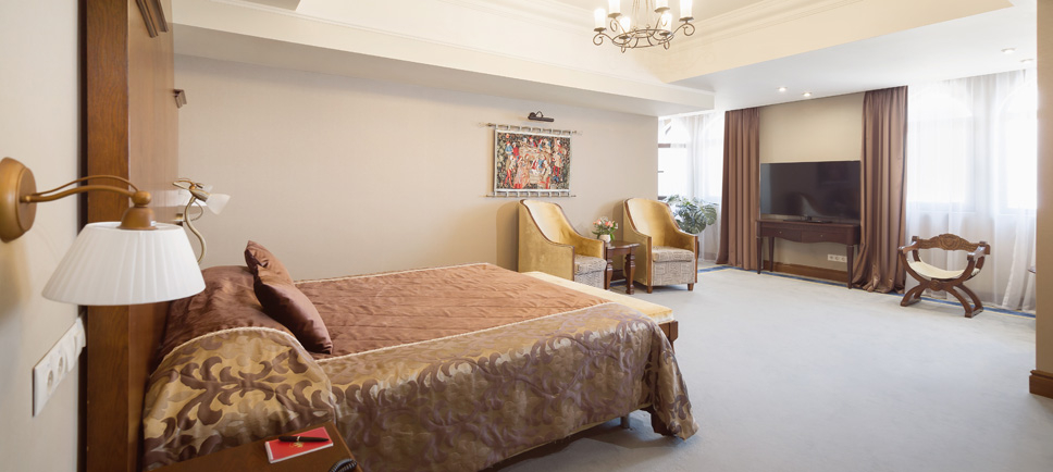 В номере: двуспальная кровать, LCD TV, телефон, прикроватная кушетка, тумбы. В гостиной - рабочее место, спутниковое ТВ, диван, встроенные шкафы, сундук-багажница, зеркало, мни-бар, письменный стол, электрочайник, электрокамин.
