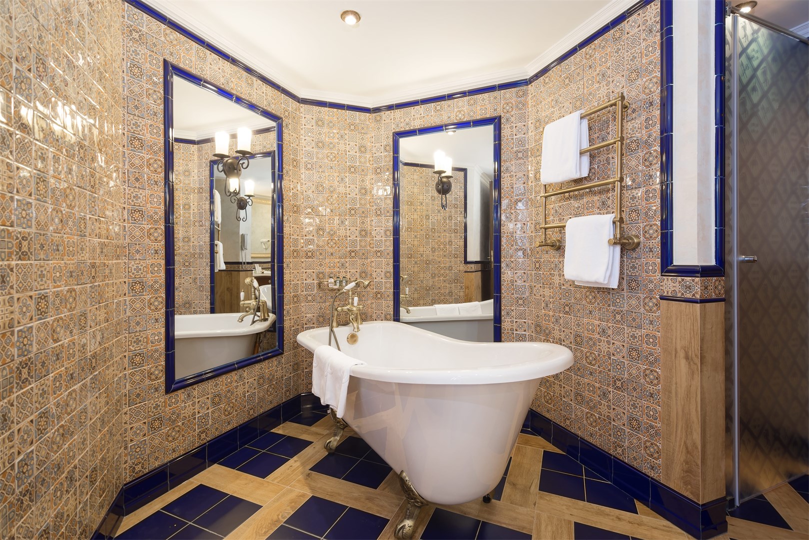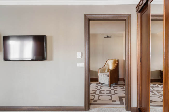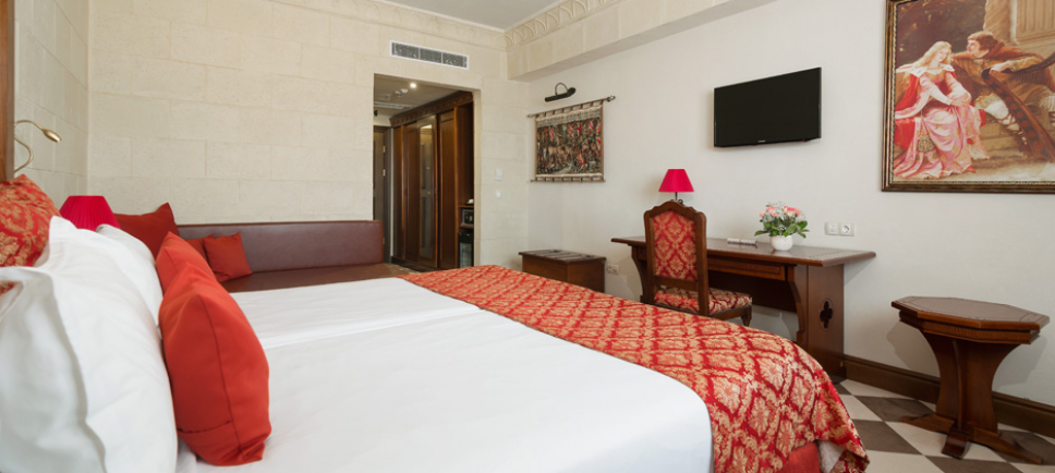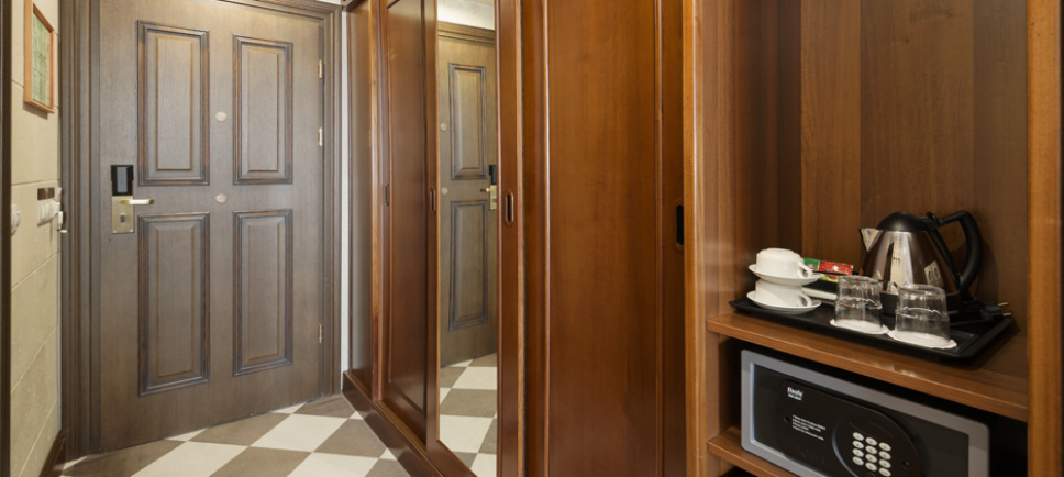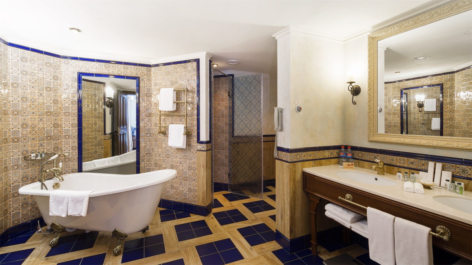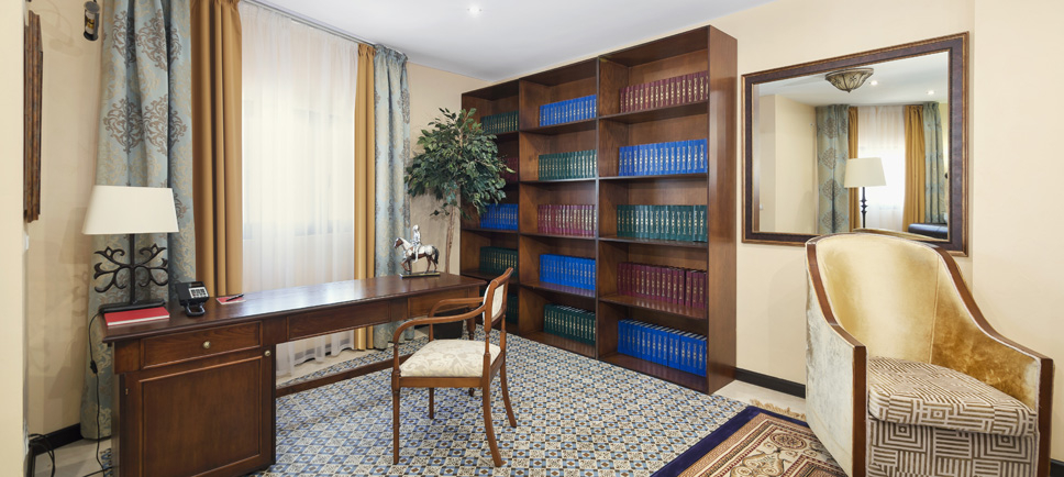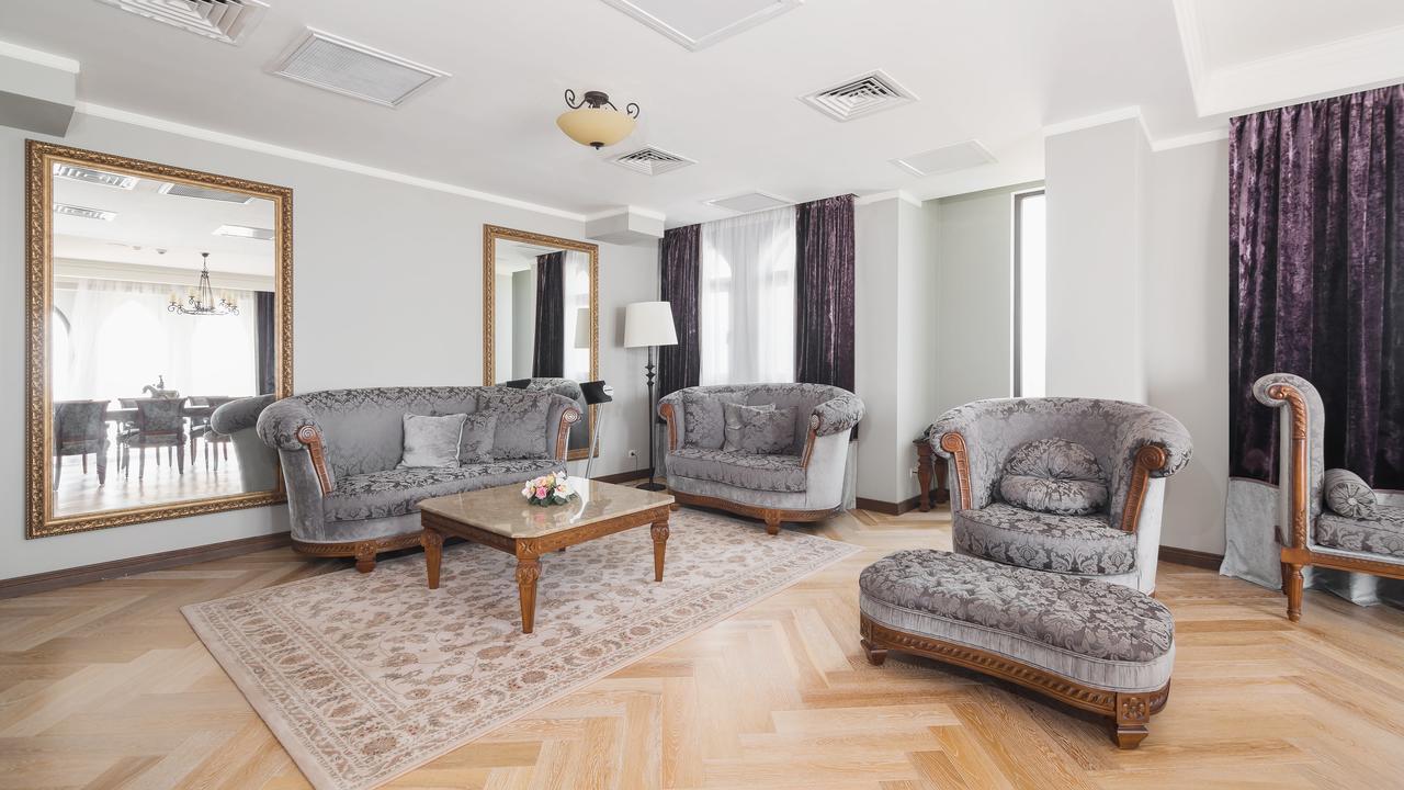 В номере: двуспальная кровать, LCD TV, телефон, прикроватная кушетка, тумбы. В гостиной - рабочее место, спутниковое ТВ, диван, встроенные шкафы, сундук-багажница, зеркало, мни-бар, письменный стол, электрочайник, электрокамин.