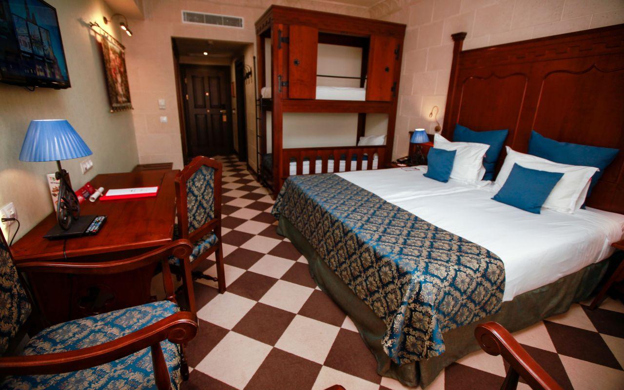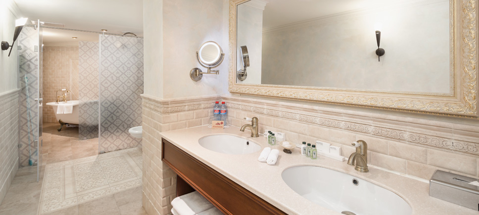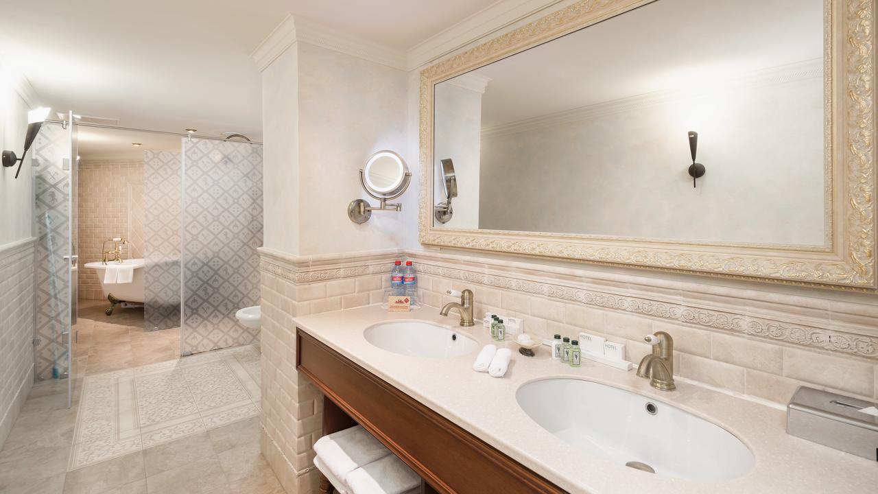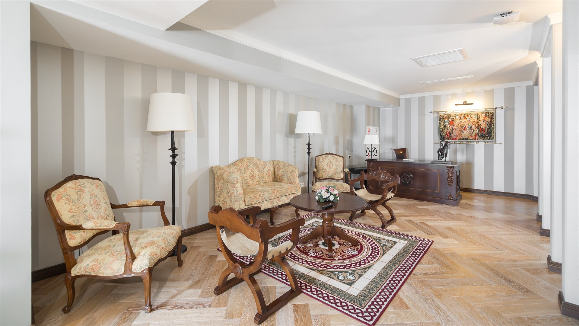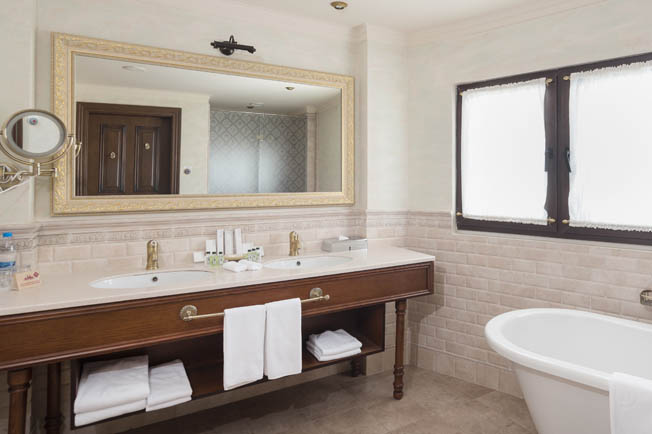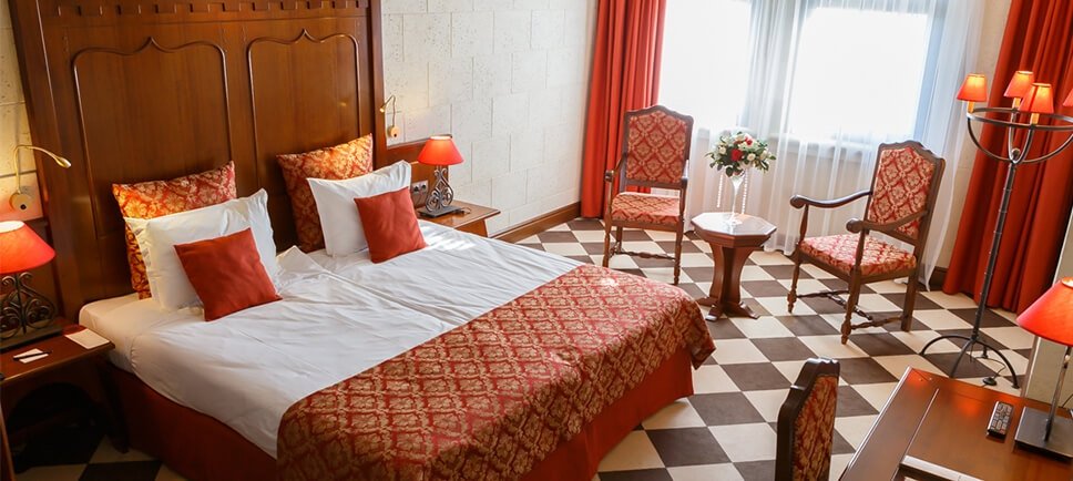 В номере: двуспальная кровать, LCD TV, телефон, прикроватная кушетка, тумбы. В гостиной - рабочее место, спутниковое ТВ, диван, встроенные шкафы, сундук-багажница, зеркало, мни-бар, письменный стол, электрочайник, электрокамин.