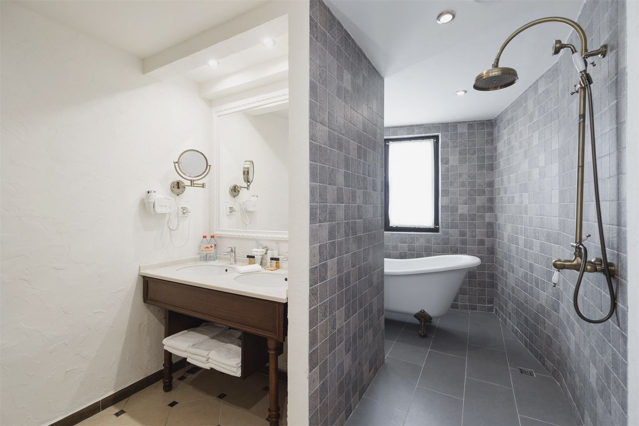 В ванной: душ, ванная, умывальник, туалет, фен, набор полотенец.