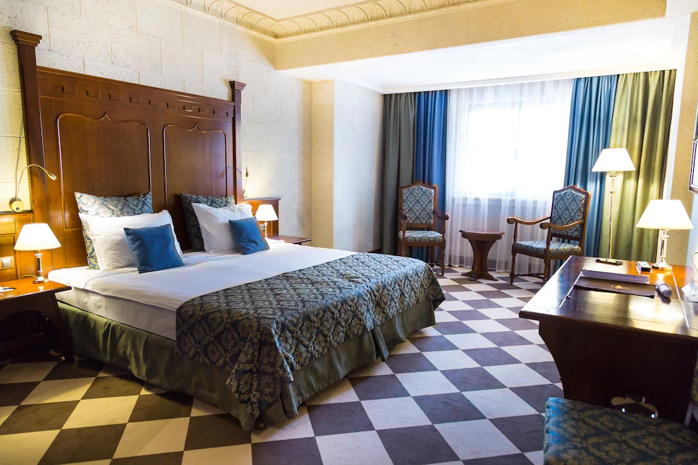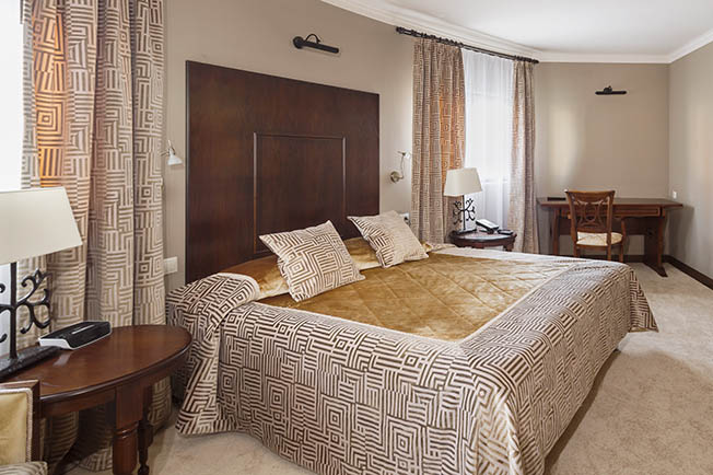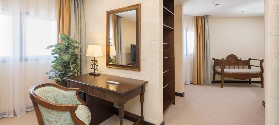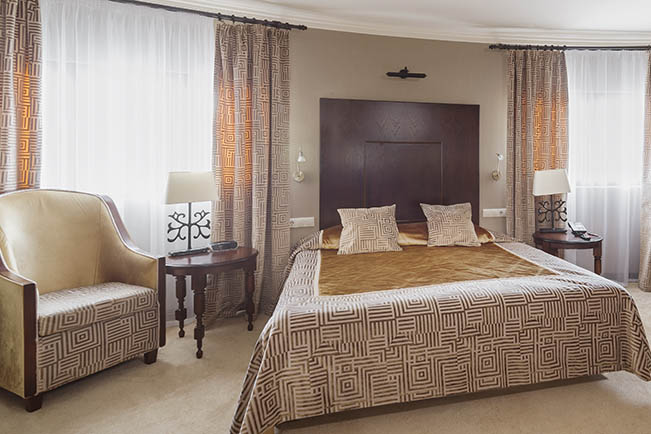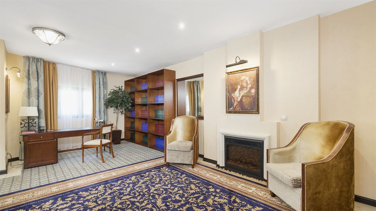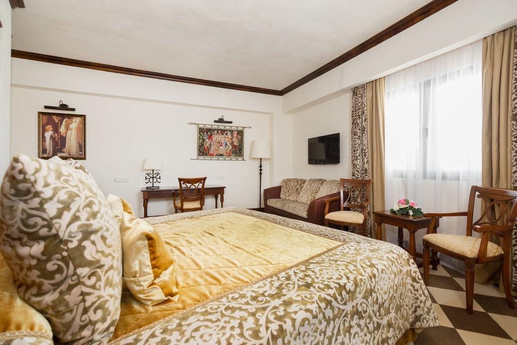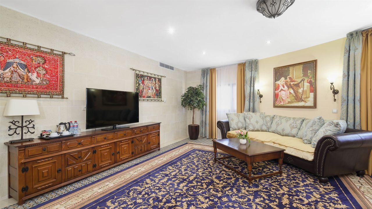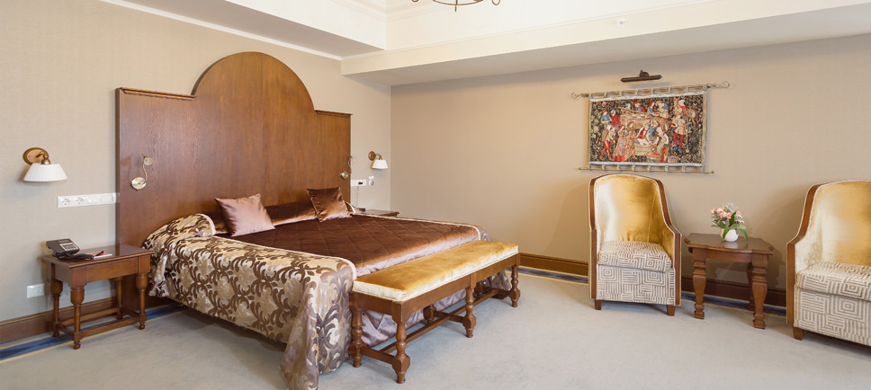 В номере: двуспальная кровать, LCD TV, телефон, прикроватная кушетка, тумбы. В гостиной - рабочее место, спутниковое ТВ, диван, встроенные шкафы, сундук-багажница, зеркало, мни-бар, письменный стол, электрочайник, электрокамин.